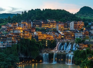 Cascata di Furong: Una spettacolare cascata alta 60 metri che si getta nel fiume, nel bel mezzo della città antica.